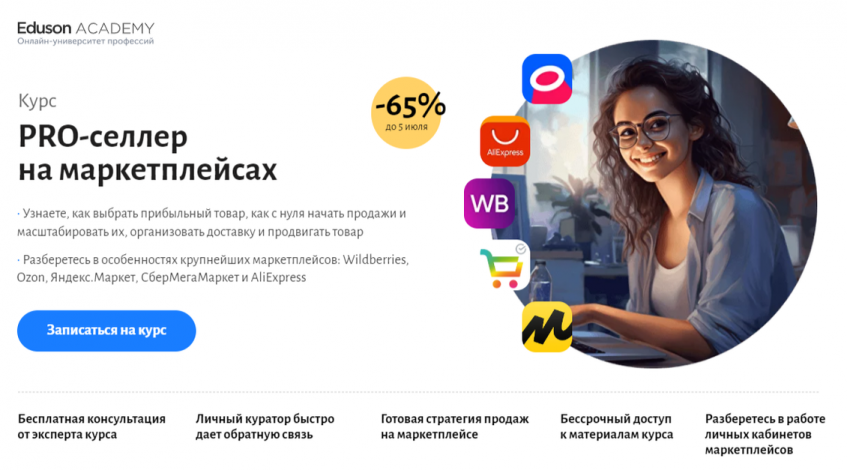 Вывод: Eduson предлагает сбалансированный курс с сильной практической составляющей, поддержкой кураторов и гарантией результата, что делает его отличным выбором для тех, кто хочет стать профессионалом в управлении маркетплейсами.